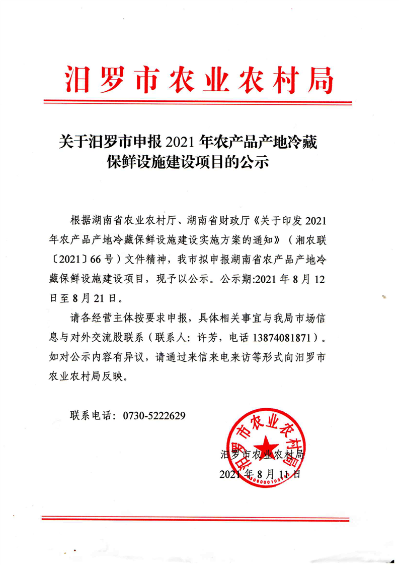 关于汨罗市申报2021年农产品产地冷藏保鲜设施建设项目的公示