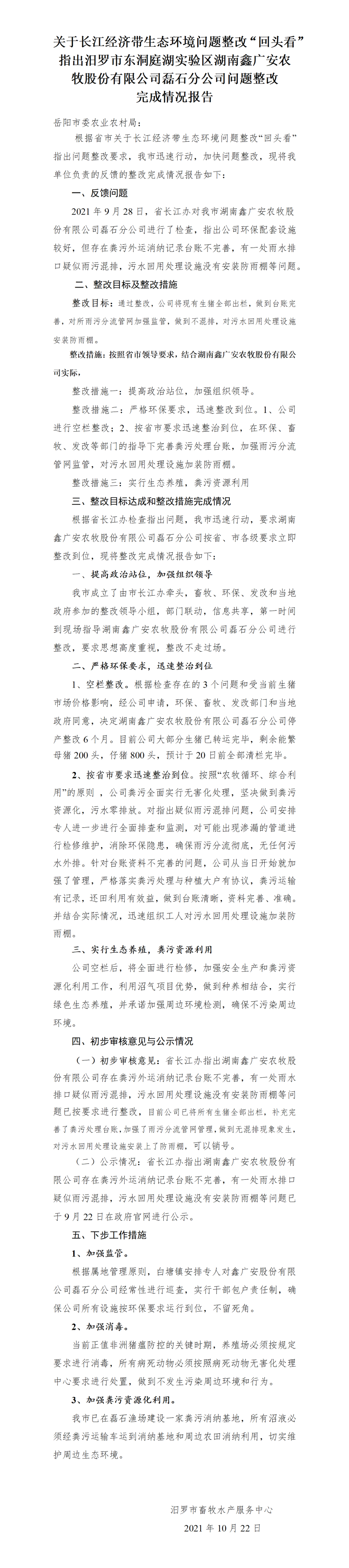 关于长江经济带生态环境问题整改“回头看”指出汨罗市东洞庭湖实验区湖南鑫广安农牧股份有限公司磊石分公司问题整改完成情况报告