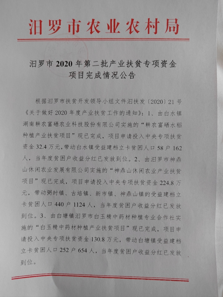 汨罗市2020年第二批产业扶贫专项资金项目完成情况公告