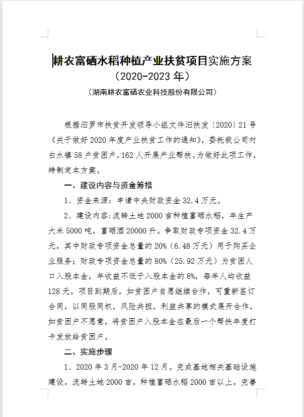 汨罗市2020年产业扶贫项目耕农富硒水稻种植产业扶贫项目实施方案