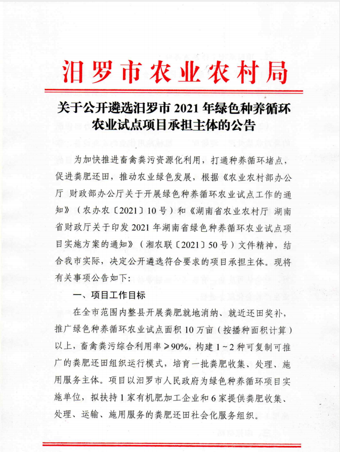 关于公开遴选汨罗市2021年绿色种养循环农业试点项目承担主体的公告