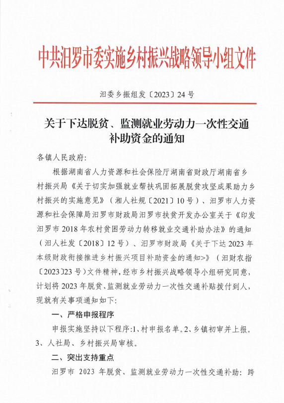 关于下达脱贫、监测就业劳动力一次性交通补助资金的通知