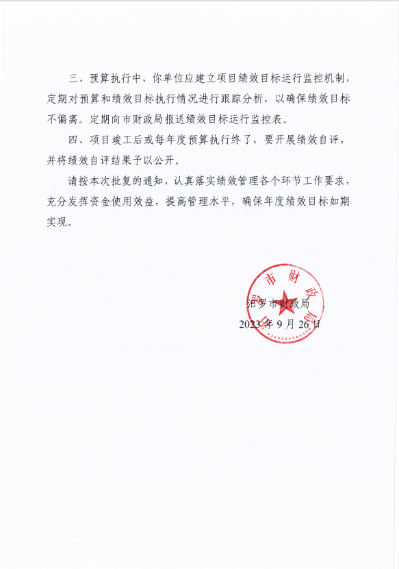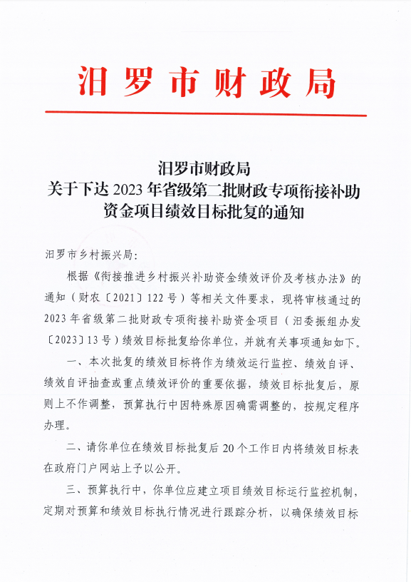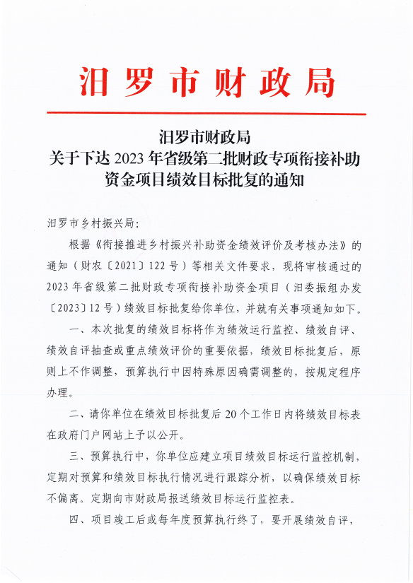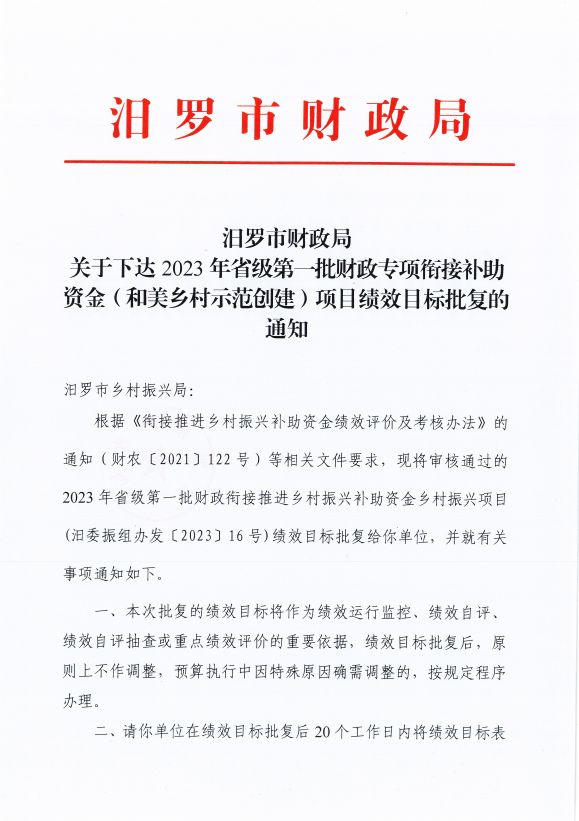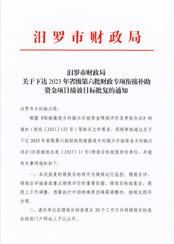 汨罗市财政局关于下达2023年省级第一批、第二批、第六批财政专项衔接补助资金项目绩效目标批复的通知