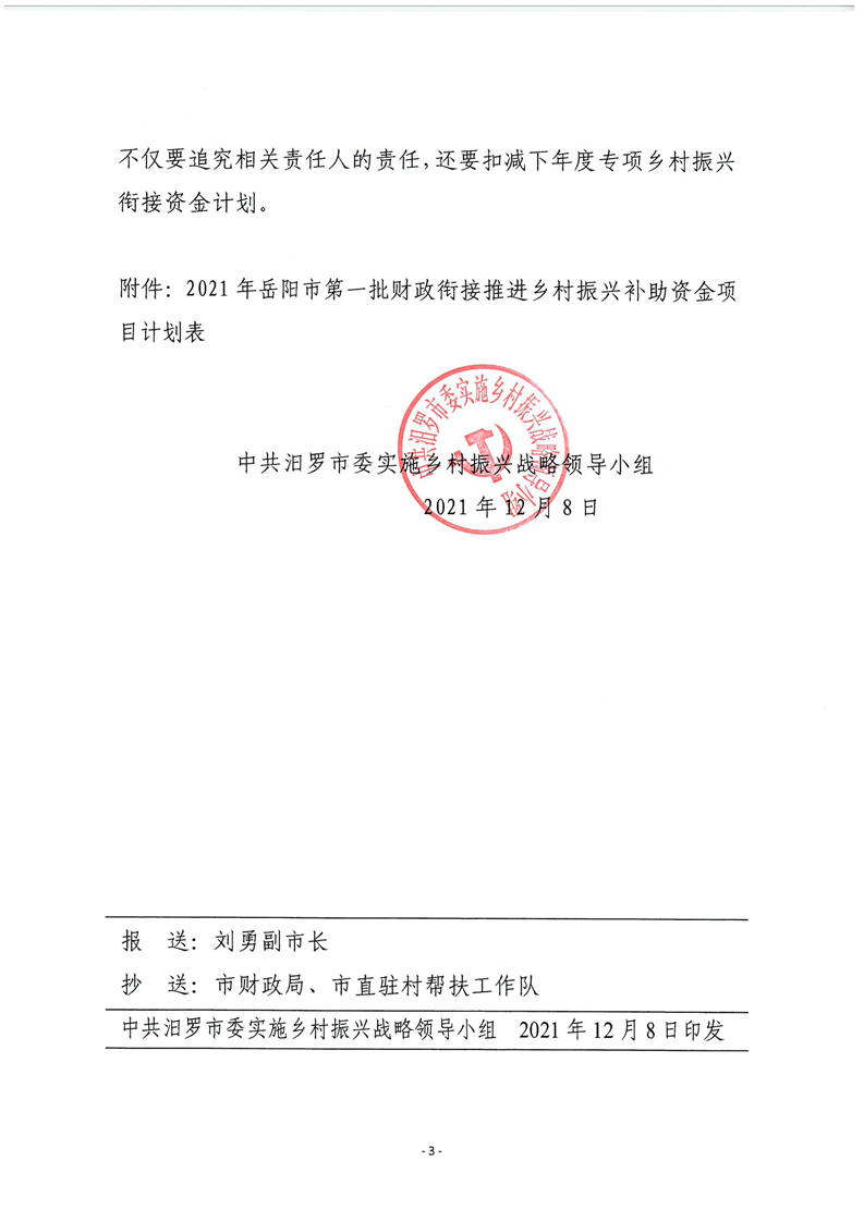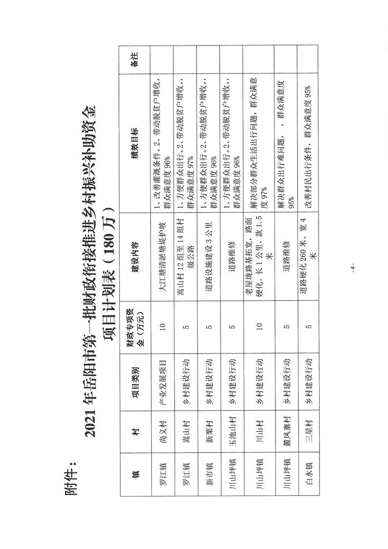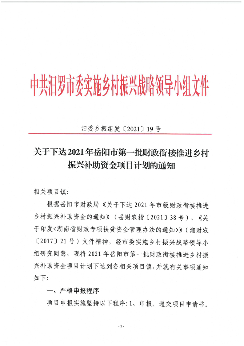 关于下达2021年岳阳市第一批财政衔接推进乡村振兴补助资金项目计划的通知