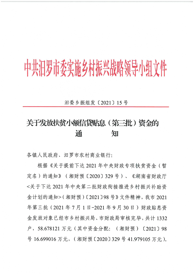 关于发放扶贫小额信贷贴息(第三批)资金的通知