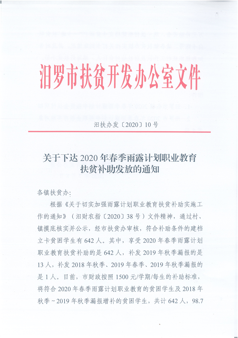 关于下达2020年春季雨露计划职业教育扶贫补助发放的通知