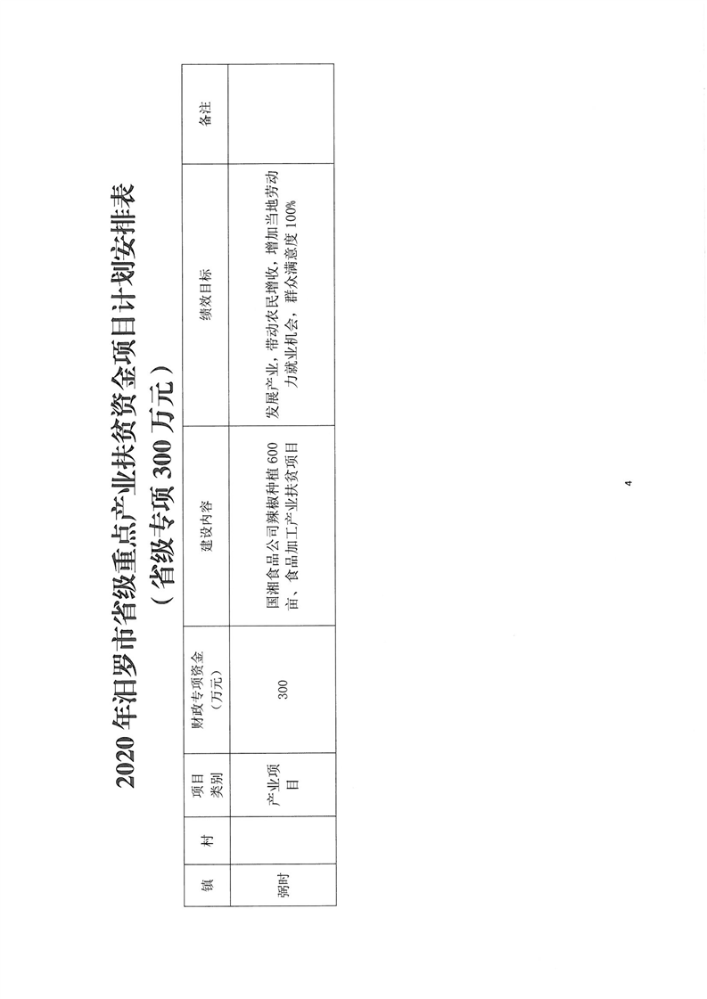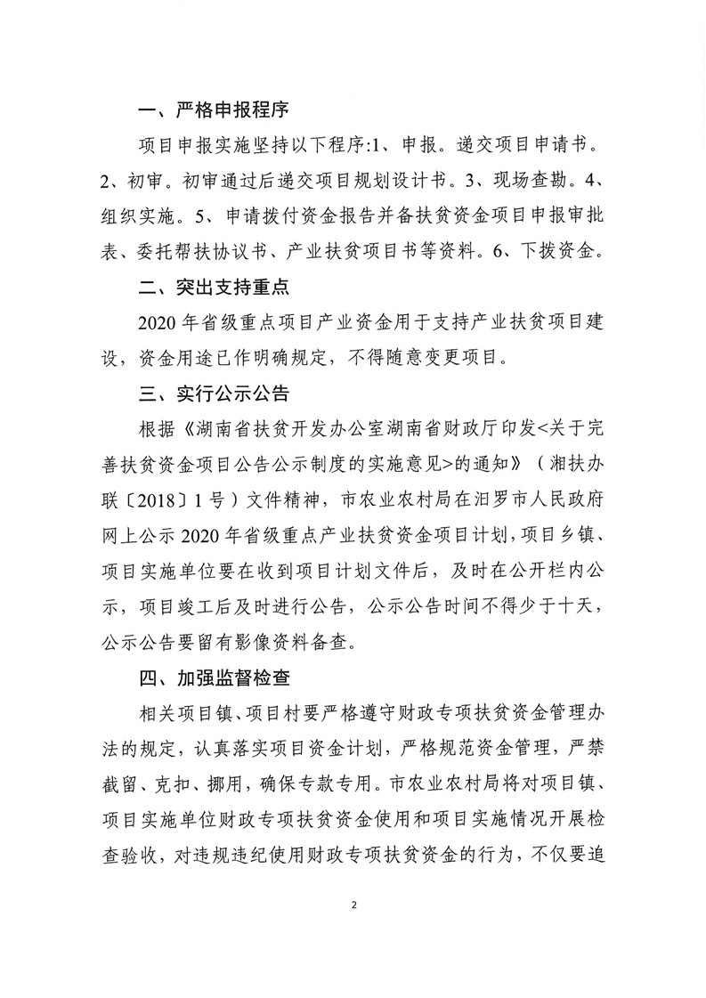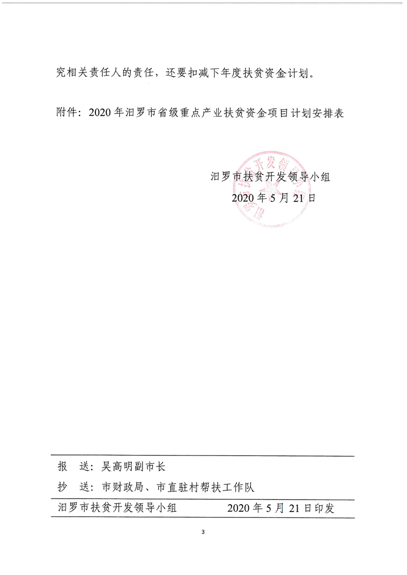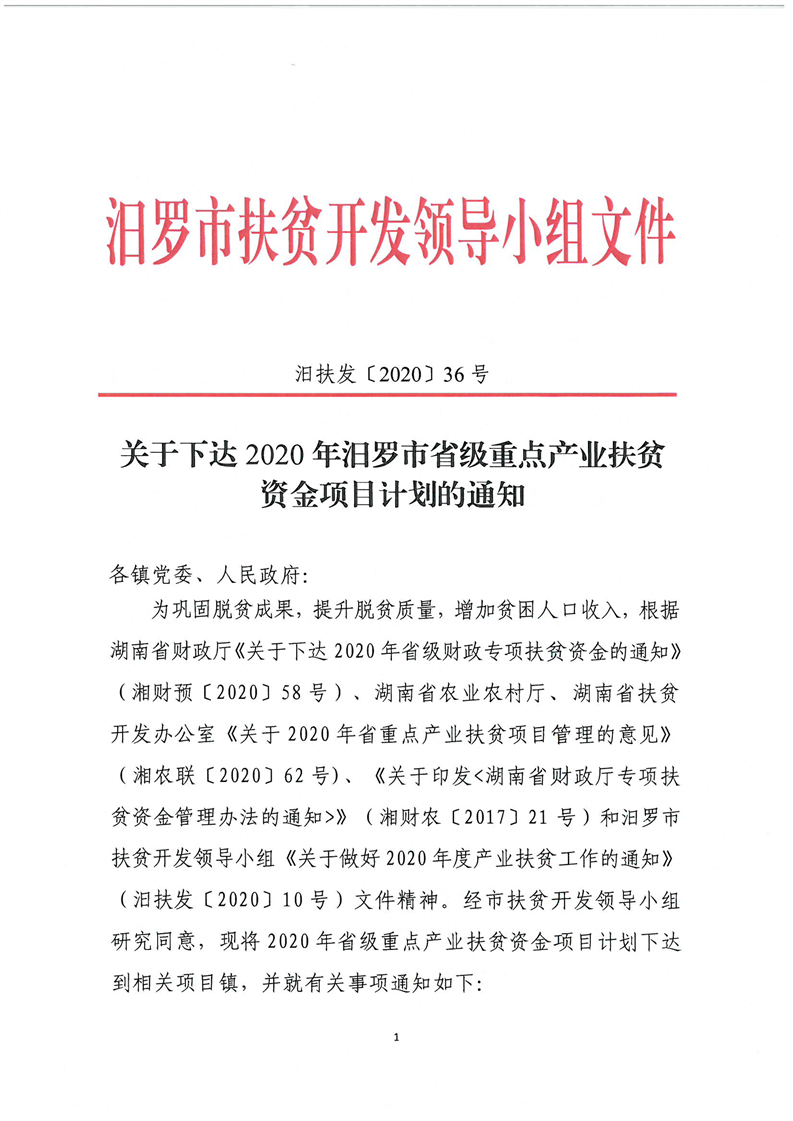 关于下达2020年汨罗市省级重点产业扶贫资金项目计划的通知