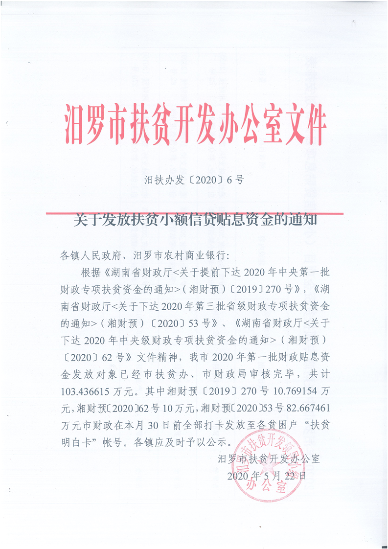 关于发放扶贫小额信贷贴息资金的通知(2020年第一批)