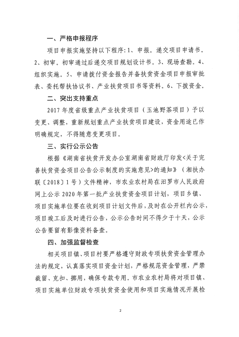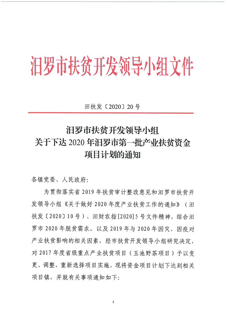 关于下达2020年汨罗市第一批产业扶贫资金项目计划的通知