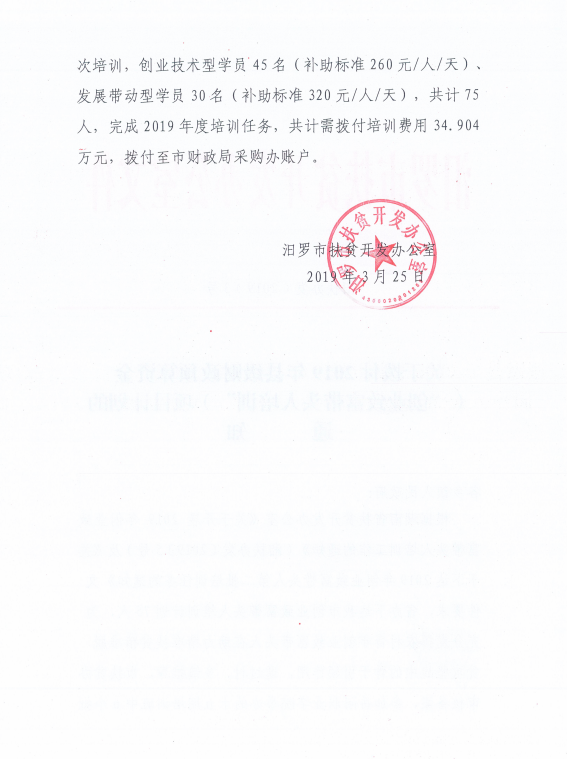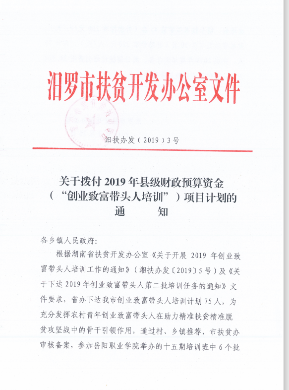 关于拨付2019年县级财政预算资金(“创业致富带头人培训”)项目计划的通知