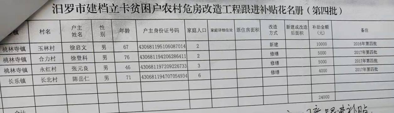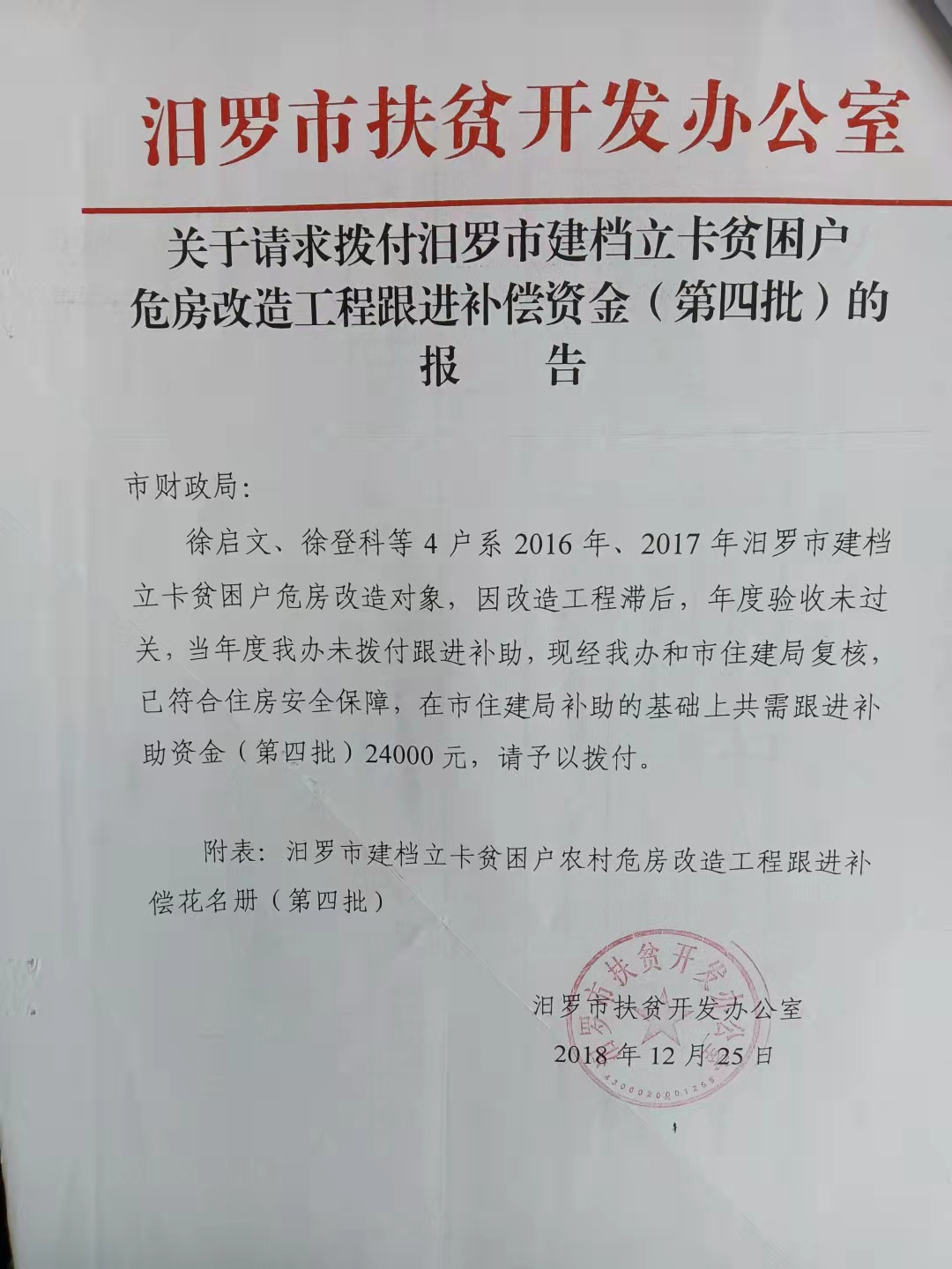 关于拨付汨罗市建档立卡危房改造跟进补助资金(第四批)