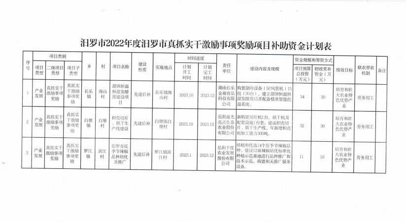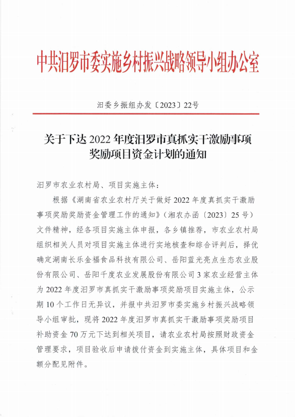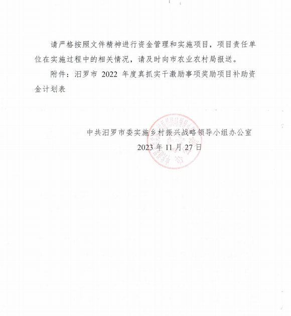 关于下达2022年度汨罗市真抓实干激励事项奖励项目资金计划的通知