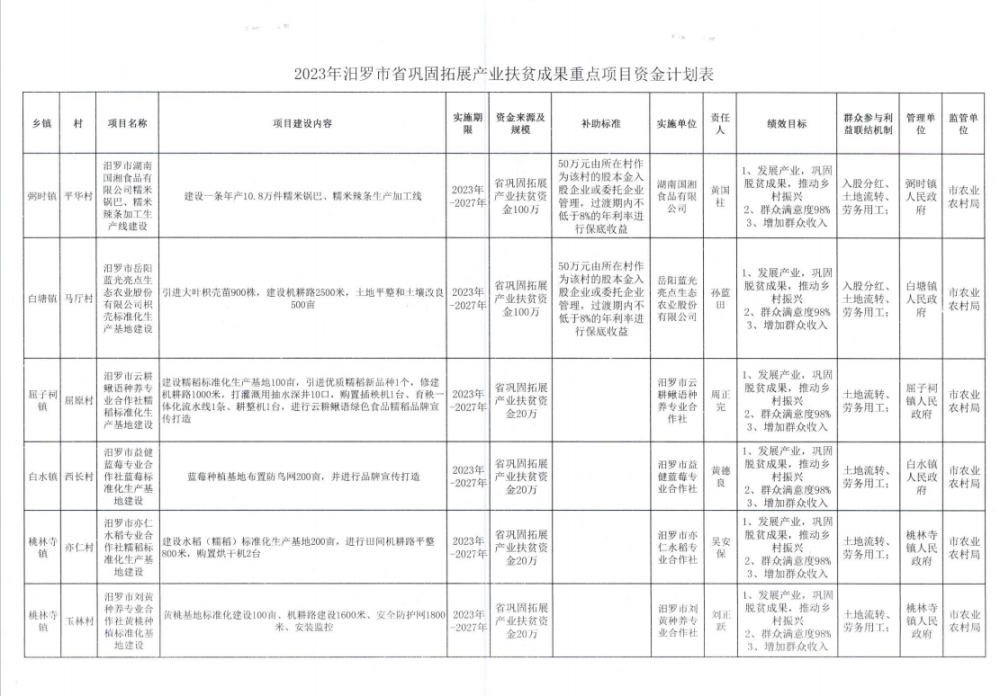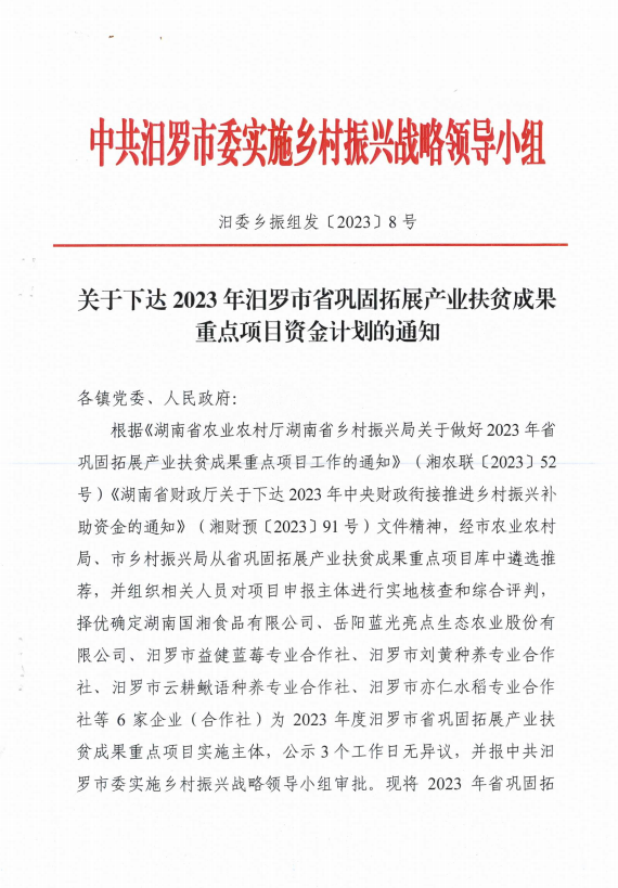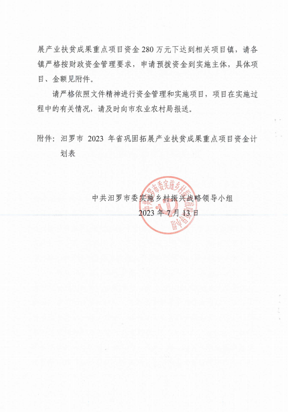 关于下达2023年汨罗市省巩固拓展产业扶贫成果重点项目资金计划的通知