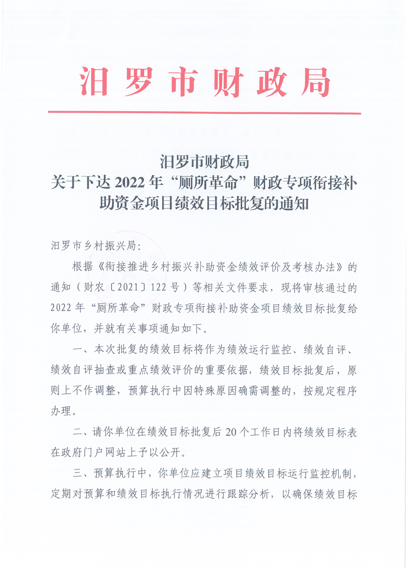 由我单位负责组织实施的2022年“厕所革命”财政专项衔接补助资金项目绩效目标已经市财政部门批复《汨罗市财政局关于下达2022年“厕所革命”财政专项衔接补助资金财政专项衔接补助资金项目绩效目标批复的通知》,根据绩效管理工作要求,现将批复后的绩效目标予以公开。