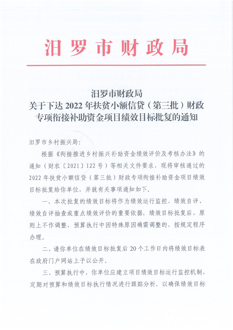 由我单位负责组织实施的2022年扶贫小额信贷(第三批)财政专项衔接补助资金项目绩效目标已经市财政部门批复《汨罗市财政局关于下达2022年扶贫小额信贷(第三批)项目绩效目标批复的通知》,根据绩效管理工作要求,现将批复后的绩效目标予以公开。