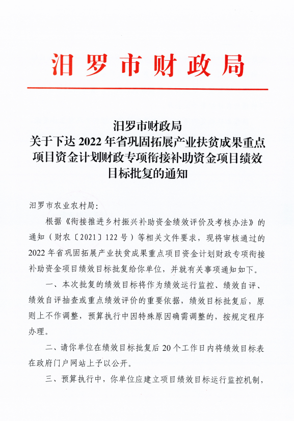 由我单位负责组织实施的2022年省巩固拓展产业扶贫成果重点项目资金计划财政专项扶贫资金项目绩效目标已经市财政部门批复《汨罗市财政局关于下达2022年省巩固拓展产业扶贫成果重点项目资金计划财政专项扶贫资金财政衔接推进乡村振兴补助资金绩效目标批复的通知》,根据绩效管理工作要求,现将批复后的绩效目标予以公开。