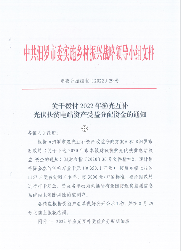 关于公布2022年渔光互补光伏扶贫电站资产收益分配资金的通知