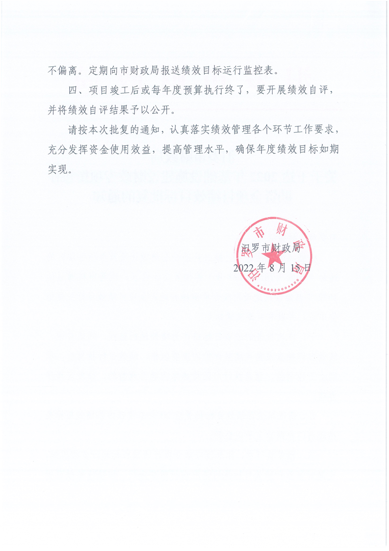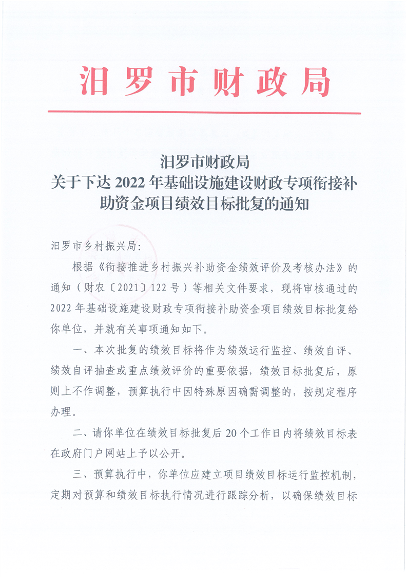 由我单位负责组织实施的2022年省级第三批财政专项衔接补助资金(基础设施建设)项目绩效目标已经市财政部门批复《汨罗市财政局关于下达2022年省级第三批财政专项衔接补助资金(基础设施建设)项目绩效目标批复的通知》,根据绩效管理工作要求,现将批复后的绩效目标予以公开。
