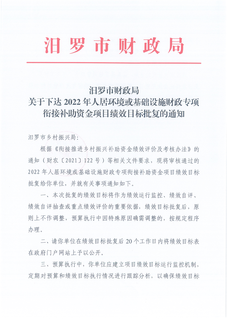 由我单位负责组织实施的2022年省级第六批财政专项衔接补助资金(人居环境或基础设施)项目绩效目标已经市财政部门批复《汨罗市财政局关于下达2022年省级第六批财政专项衔接补助资金(人居环境或基础设施)项目绩效目标批复的通知》,根据绩效管理工作要求,现将批复后的绩效目标予以公开。
