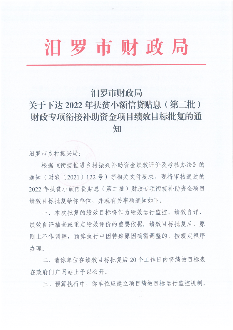 由我单位负责组织实施的2022年扶贫小额信贷贴息(第二批)财政专项衔接补助资金项目绩效目标已经市财政部门批复《汨罗市财政局关于下达2022年扶贫小额信贷(第二批)项目绩效目标批复的通知》,根据绩效管理工作要求,现将批复后的绩效目标予以公开。