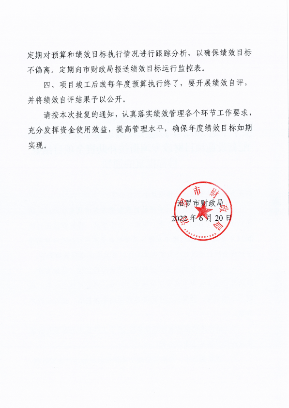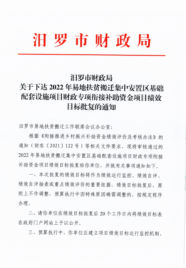 由我单位负责组织实施的2022年异地扶贫搬迁集中安置区基础配套设施项目财政专项扶贫资金项目绩效目标已经市财政部门批复《汨罗市财政局关于下达2022年异地扶贫搬迁集中安置区基础配套设施项目财政专项扶贫资金财政衔接推进乡村振兴补助资金绩效目标批复的通知》,根据绩效管理工作要求,现将批复后的绩效目标予以公开。