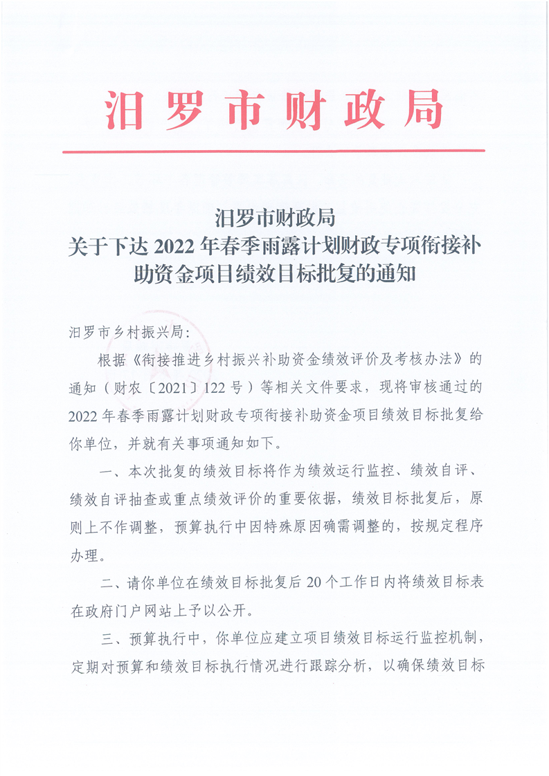 由我单位负责组织实施的2022年春季雨露计划财政专项衔接补助资金项目绩效目标已经市财政部门批复《汨罗市财政局关于下达2022年春季雨露计划财政专项衔接补助资金项目绩效目标批复的通知》,根据绩效管理工作要求,现将批复后的绩效目标予以公开。