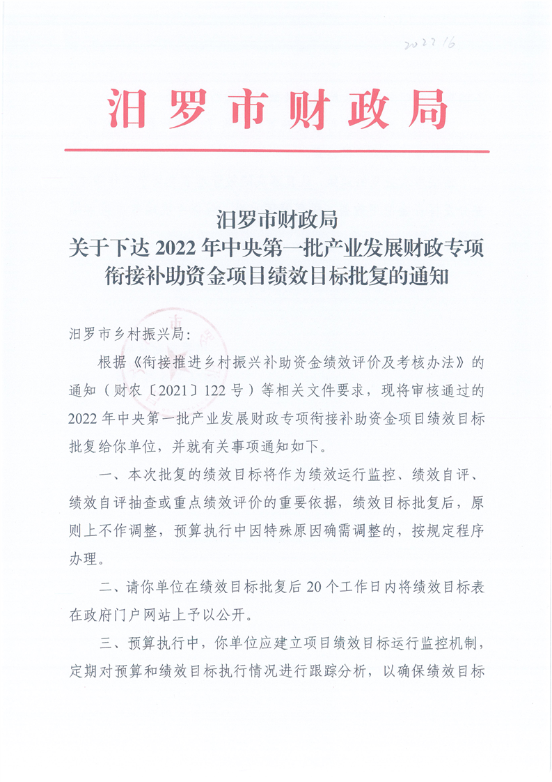由我单位负责组织实施的2022年中央第一批产业发展财政专项衔接补助资金项目绩效目标已经市财政部门批复《汨罗市财政局关于下达2022年中央第一批产业发展财政专项衔接补助资金项目绩效目标批复的通知》,根据绩效管理工作要求,现将批复后的绩效目标予以公开。