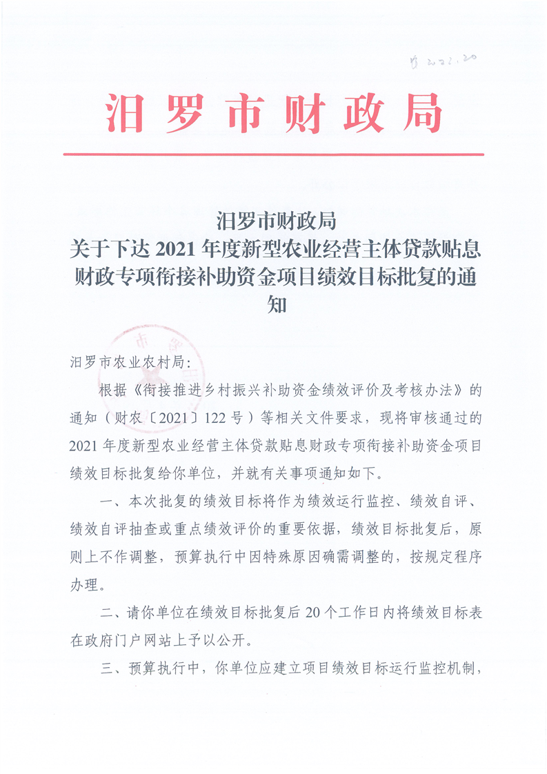 由我单位负责组织实施的2021年度新型农业经营主体贷款贴息财政专项衔接补助资金项目绩效目标已经市财政部门批复《汨罗市财政局关于下达2021年度新型农业经营主体贷款贴息财政专项衔接补助资金项目绩效目标批复的通知》,根据绩效管理工作要求,现将批复后的绩效目标予以公开。