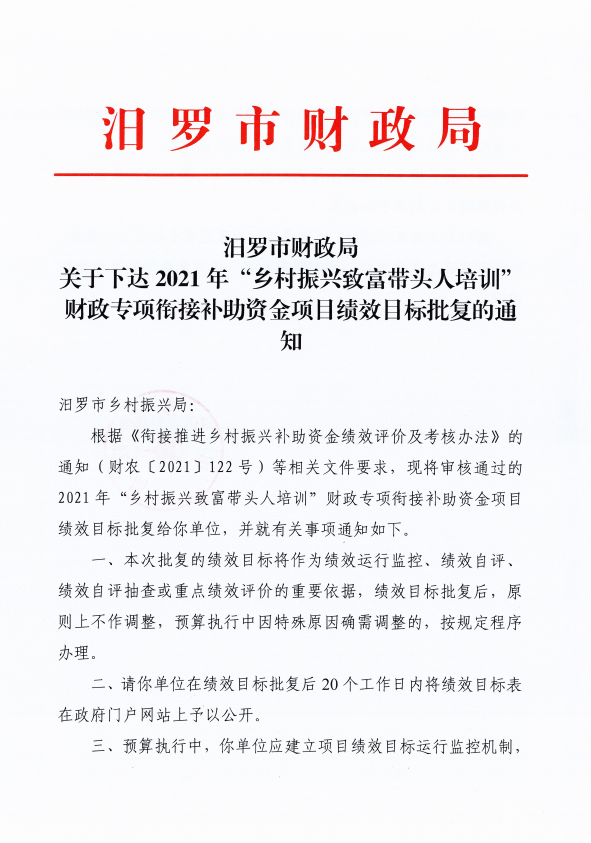 由我单位负责组织实施的2021年“乡村振兴致富带头人培训”财政专项衔接补助资金项目绩效目标已经市财政部门批复《汨罗市财政局关于下达2021年“乡村振兴致富带头人培训”财政专项衔接补助资金财政衔接推进乡村振兴补助资金绩效目标批复的通知》,根据绩效管理工作要求,现将批复后的绩效目标予以公开。