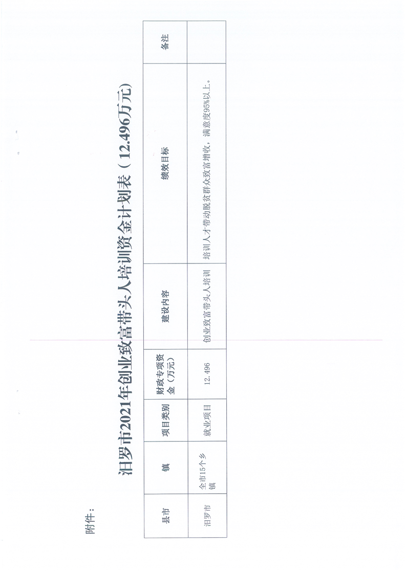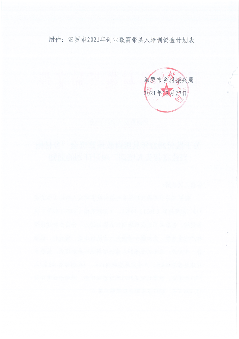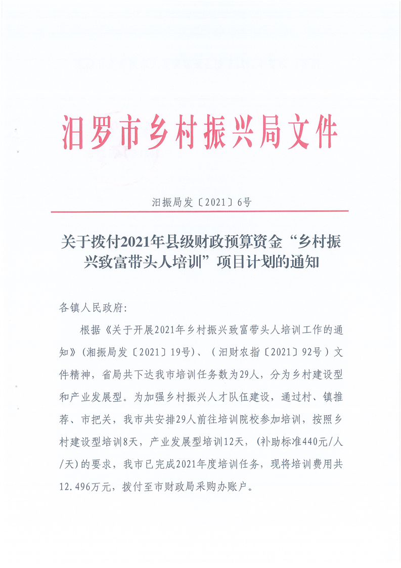 关于拨付2021年县级财政预算资金(“乡村振兴致富带头人培训”项目计划的通知)