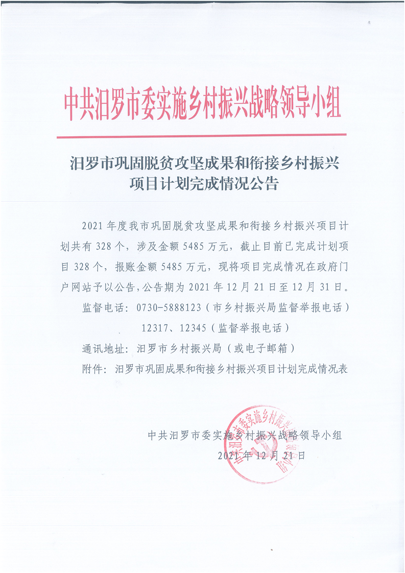 汨罗市巩固脱贫攻坚成果和衔接乡村振兴项目计划完成情况公示
