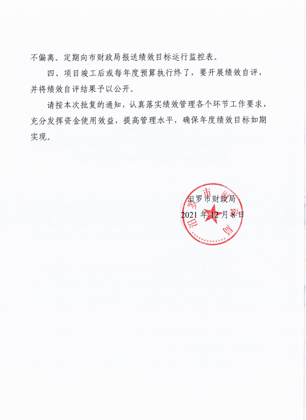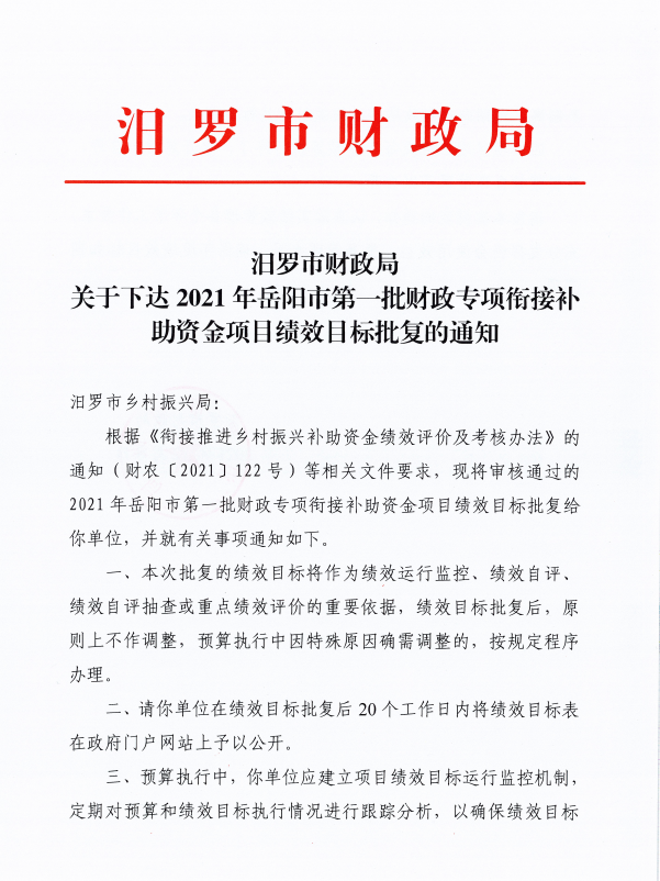 由我单位负责组织实施的2021年岳阳市第一批财政专项衔接补助资金项目绩效目标已经市财政部门批复《汨罗市财政局关于下达2021年岳阳市第一批财政专项衔接补助资金财政衔接推进乡村振兴补助资金绩效目标批复的通知》,根据绩效管理工作要求,现将批复后的绩效目标予以公开。