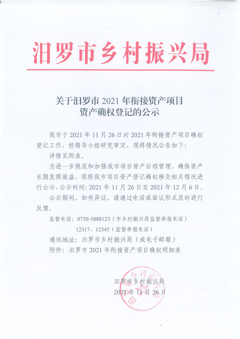 汨罗市2021年衔接资产项目资产确权登记的公示