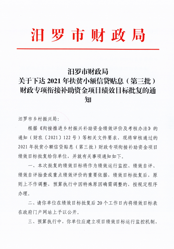 由我单位负责组织实施的2021年扶贫小额信贷贴息(第三批)财政专项衔接补助资金项目绩效目标已经市财政部门批复《汨罗市财政局关于下达2021年扶贫小额信贷贴息(第三批)财政专项衔接补助资金财政衔接推进乡村振兴补助资金绩效目标批复的通知》,根据绩效管理工作要求,现将批复后的绩效目标予以公开。
