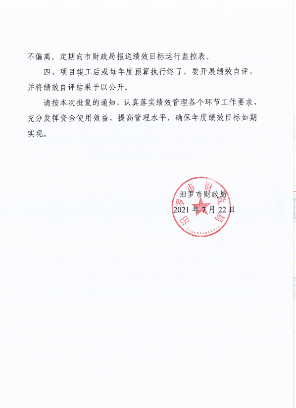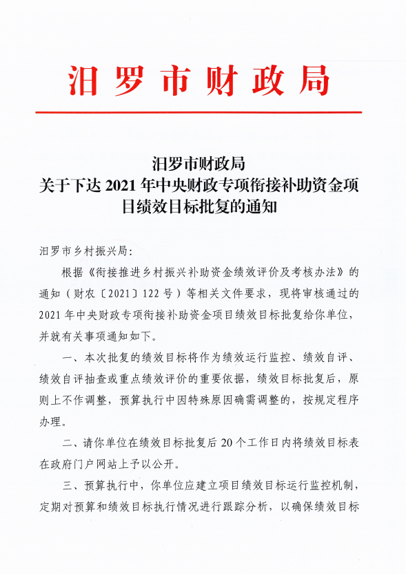 由我单位负责组织实施的2021年中央财政专项扶贫资金项目绩效目标已经市财政部门批复《汨罗市财政局关于下达2021年中央财政专项扶贫资金财政衔接推进乡村振兴补助资金绩效目标批复的通知》,根据绩效管理工作要求,现将批复后的绩效目标予以公开。