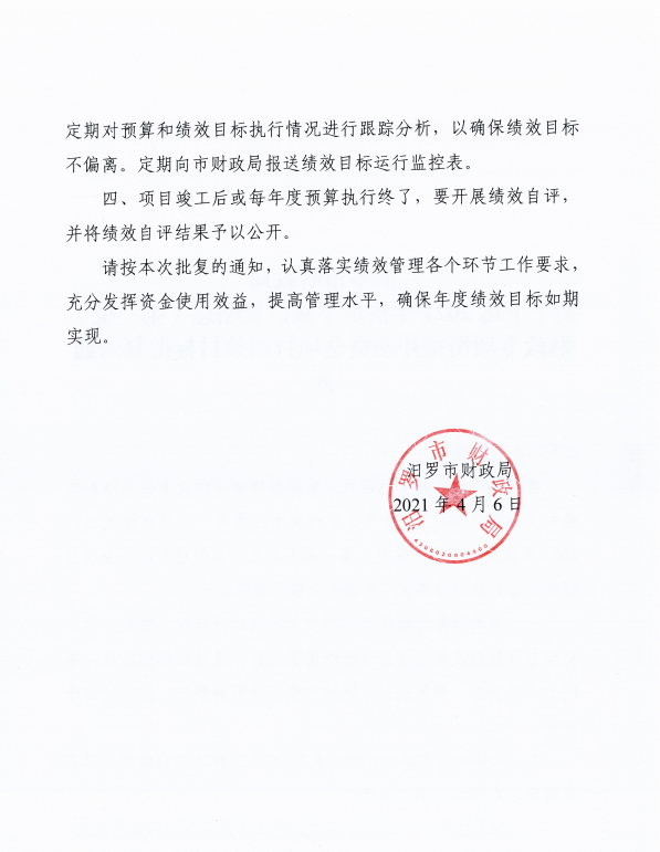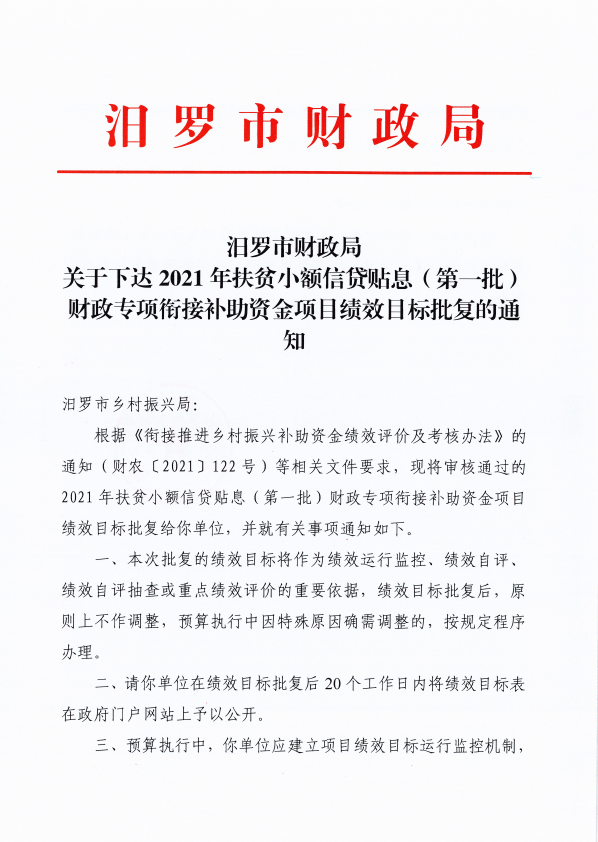 由我单位负责组织实施的2021年扶贫小额信贷贴息(第一批)财政专项扶贫资金项目绩效目标已经市财政部门批复《汨罗市财政局关于下达2021年扶贫小额信贷贴息(第一批)财政专项扶贫资金财政衔接推进乡村振兴补助资金绩效目标批复的通知》,根据绩效管理工作要求,现将批复后的绩效目标予以公开。