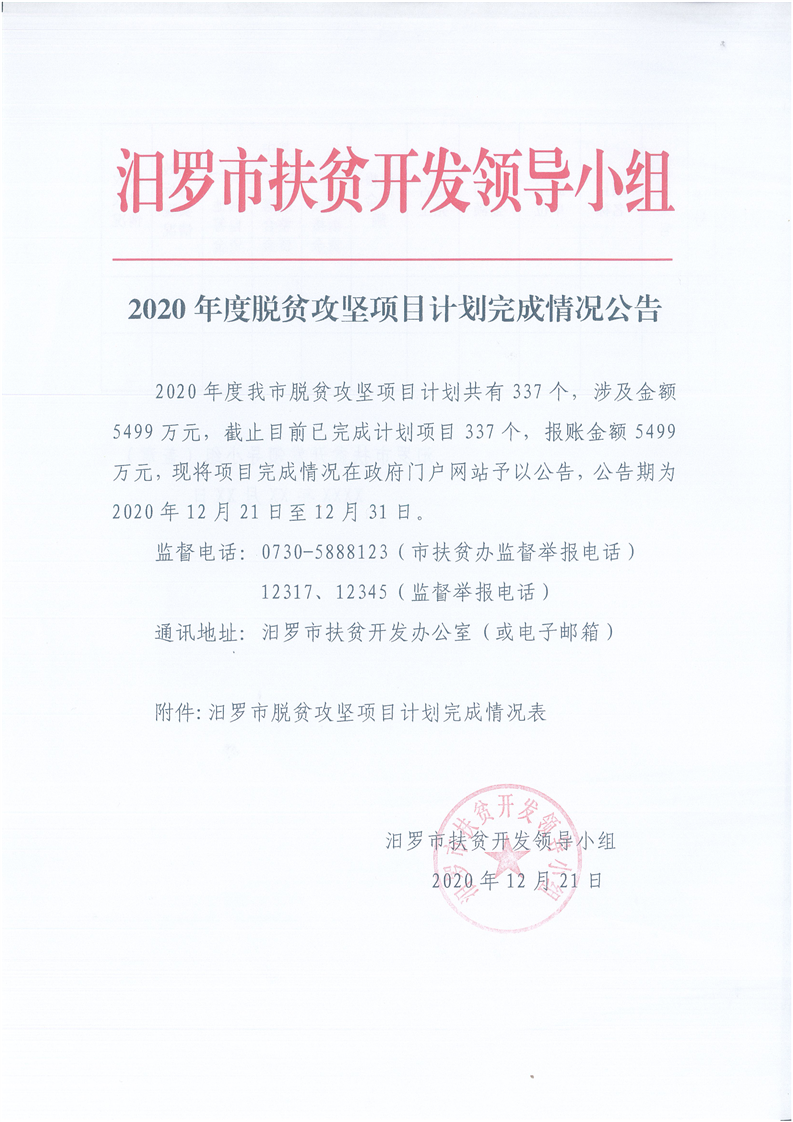 2020年度脱贫攻坚项目计划完成情况公告