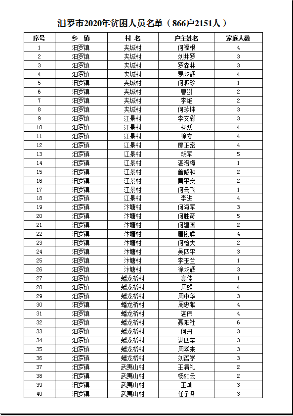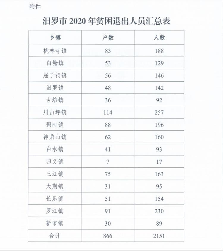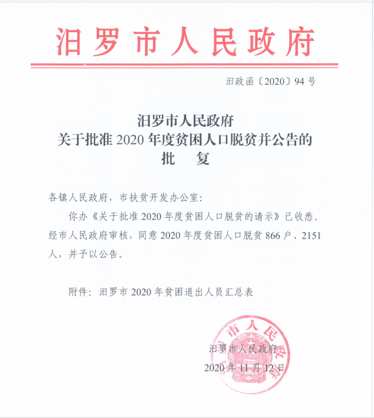 汨罗市人民政府关于批准2020年度贫困人口脱贫并公告的批复