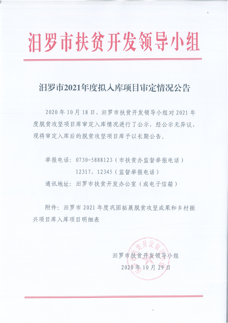 汨罗市2021年度拟入库项目审定情况公告