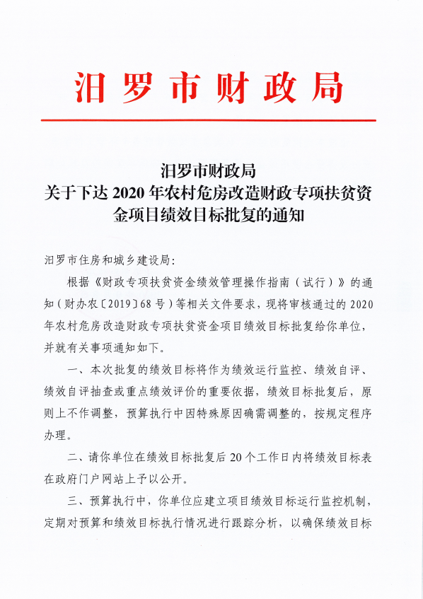 由我单位负责组织实施的2020年农村危房改造财政专项扶贫资金项目绩效目标已经市财政部门批复《汨罗市财政局关于下达2020年农村危房改造财政专项扶贫资金财政衔接推进乡村振兴补助资金绩效目标批复的通知》,根据绩效管理工作要求,现将批复后的绩效目标予以公开。