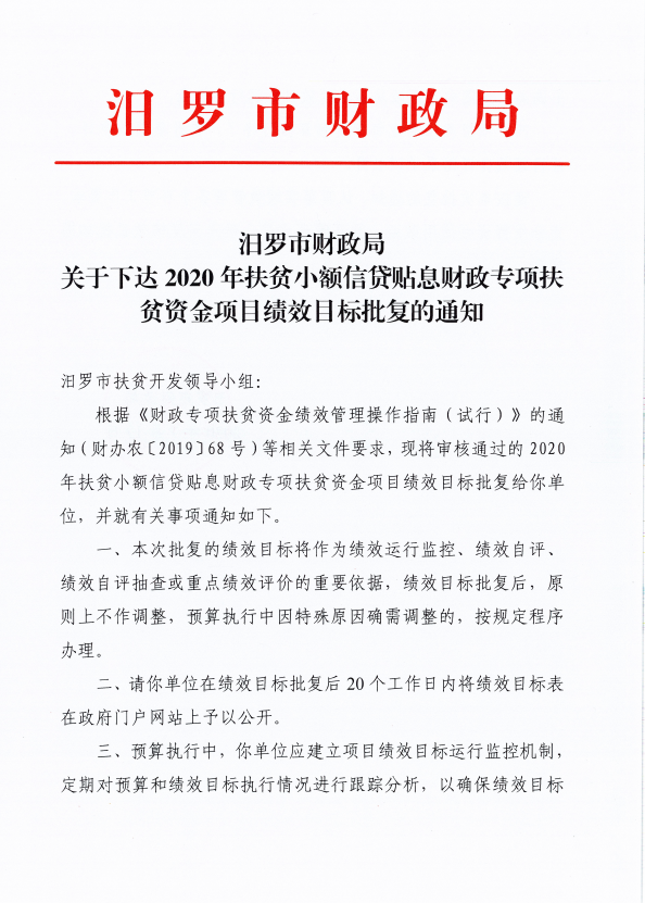 由我单位负责组织实施的2020年扶贫小额信贷贴息财政专项扶贫资金项目绩效目标已经市财政部门批复《汨罗市财政局关于下达2020年扶贫小额信贷贴息财政专项扶贫资金财政衔接推进乡村振兴补助资金绩效目标批复的通知》,根据绩效管理工作要求,现将批复后的绩效目标予以公开。
