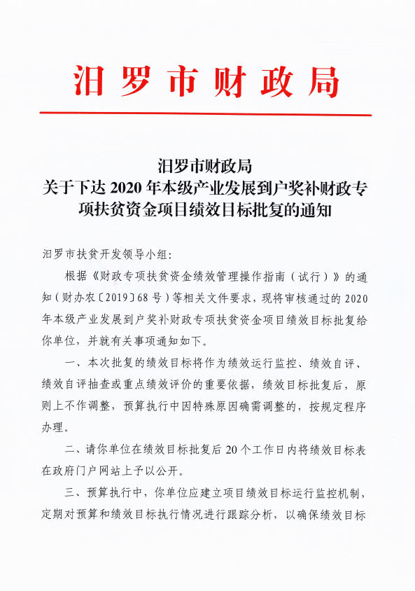 由我单位负责组织实施的2020年本级产业发展到户奖补财政专项扶贫资金项目绩效目标已经市财政部门批复《汨罗市财政局关于下达2020年本级产业发展到户奖补财政专项扶贫资金财政衔接推进乡村振兴补助资金绩效目标批复的通知》,根据绩效管理工作要求,现将批复后的绩效目标予以公开。