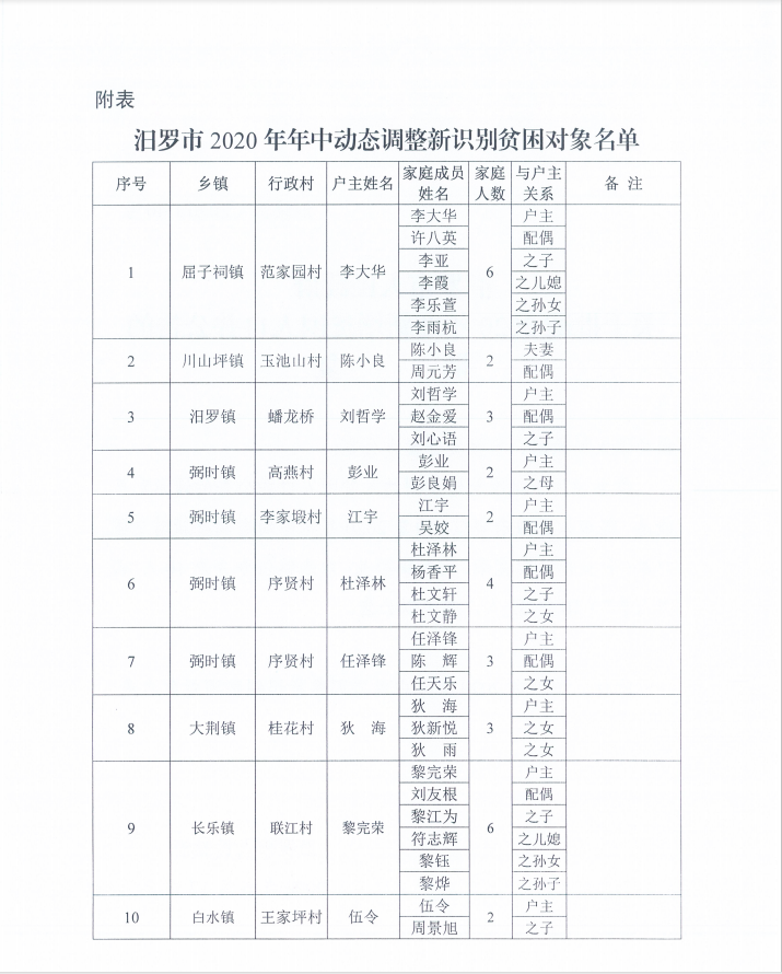 汨罗市人民政府关于批准2020年度新增贫困人口并公告的批复