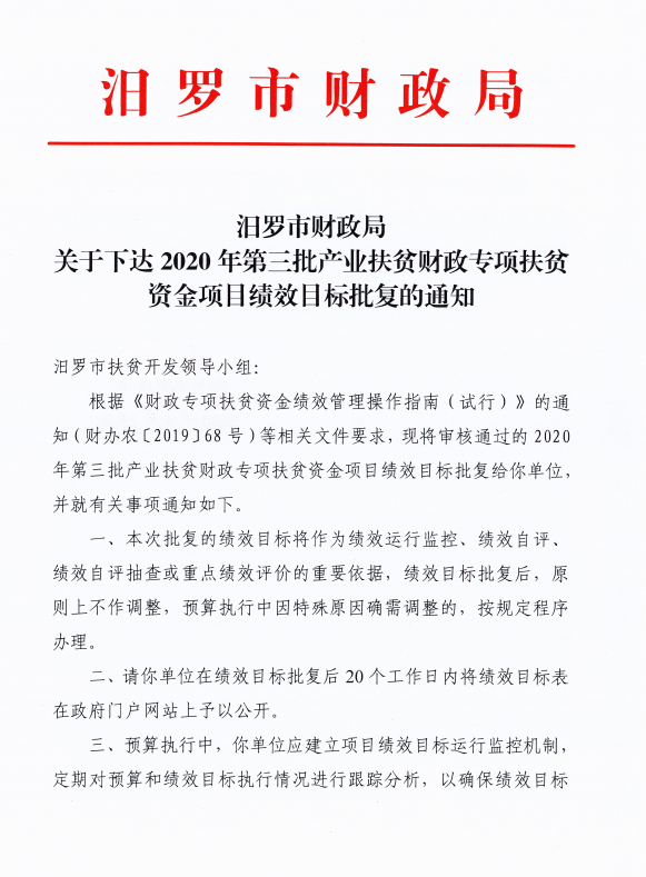 由我单位负责组织实施的2020年第三批产业扶贫财政专项扶贫资金项目绩效目标已经市财政部门批复《汨罗市财政局关于下达2020年第三批产业扶贫财政专项扶贫资金财政衔接推进乡村振兴补助资金绩效目标批复的通知》,根据绩效管理工作要求,现将批复后的绩效目标予以公开。
