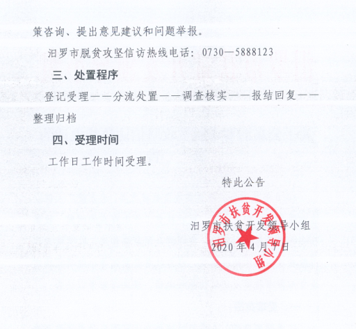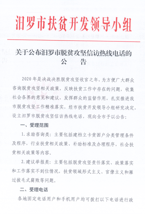 关于公布汨罗市脱贫攻坚信访热线电话的公告