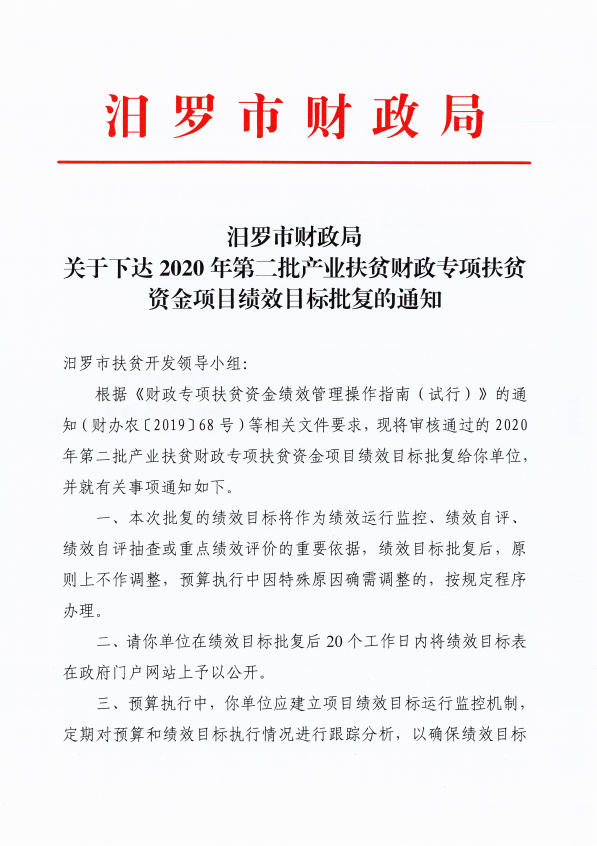 由我单位负责组织实施的2020年第二批产业扶贫财政专项扶贫资金项目绩效目标已经市财政部门批复《汨罗市财政局关于下达2020年第二批产业扶贫财政专项扶贫资金财政衔接推进乡村振兴补助资金绩效目标批复的通知》,根据绩效管理工作要求,现将批复后的绩效目标予以公开。