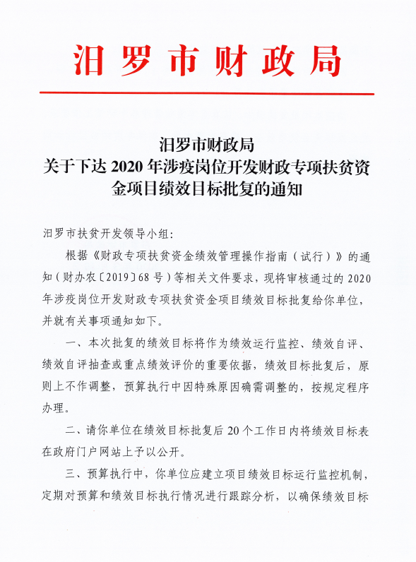 由我单位负责组织实施的涉疫岗位开发财政专项扶贫资金项目绩效目标已经市财政部门批复《汨罗市财政局关于下达涉疫岗位开发财政专项扶贫资金财政衔接推进乡村振兴补助资金绩效目标批复的通知》,根据绩效管理工作要求,现将批复后的绩效目标予以公开。
