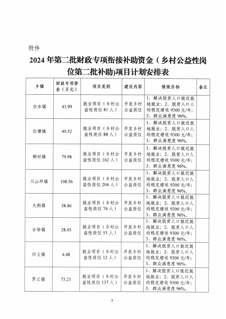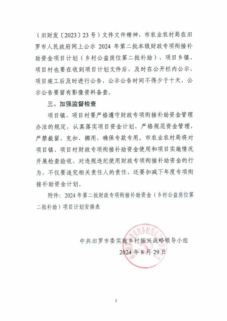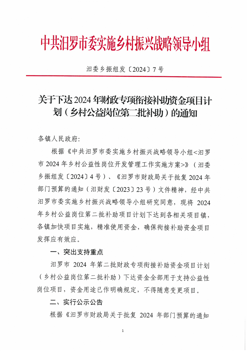 汨委乡振组发〔2024〕7号 关于下达 2024年财政专项衔接补助资金项目计划(乡村公益岗位第二批补助)的通知