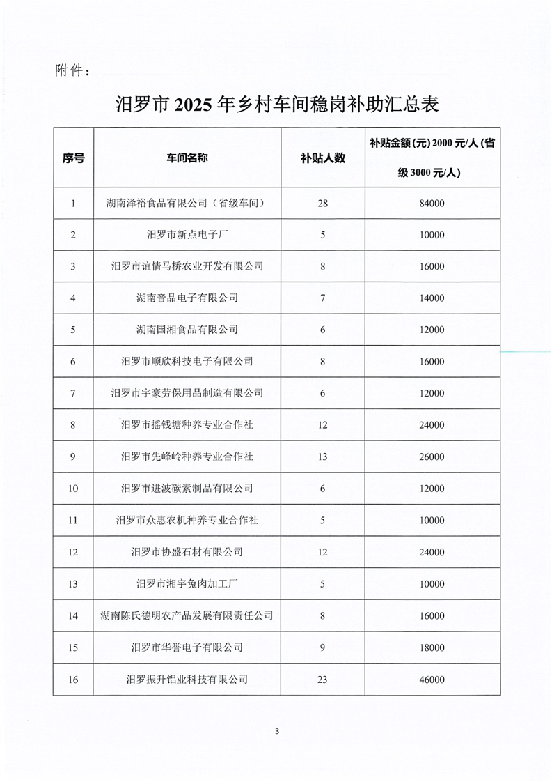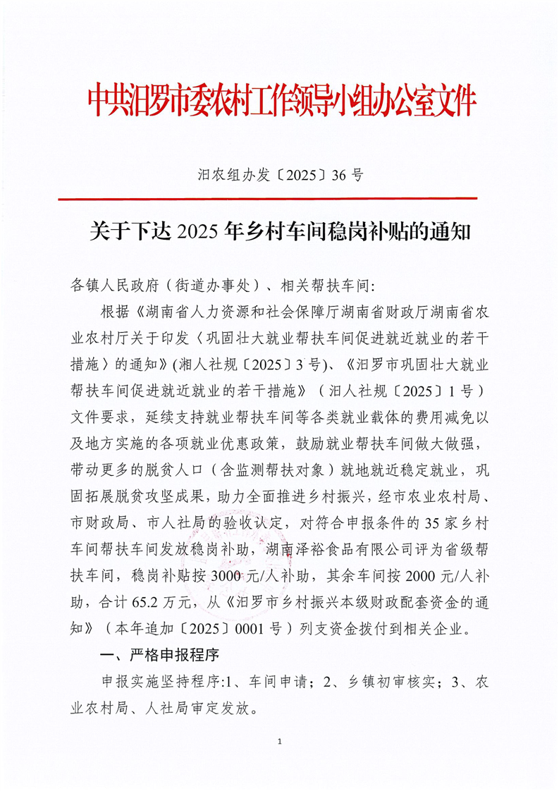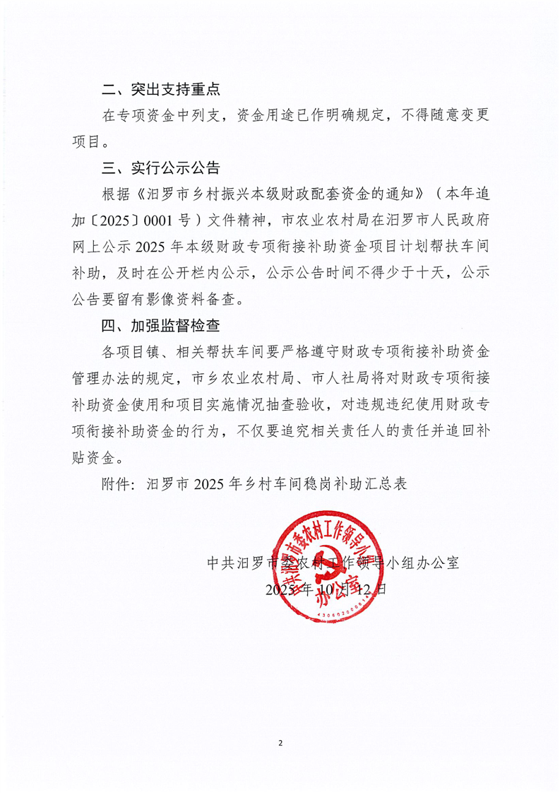 汨农组办发〔2025〕36号关于下达2025年乡村车间稳岗补贴的通知