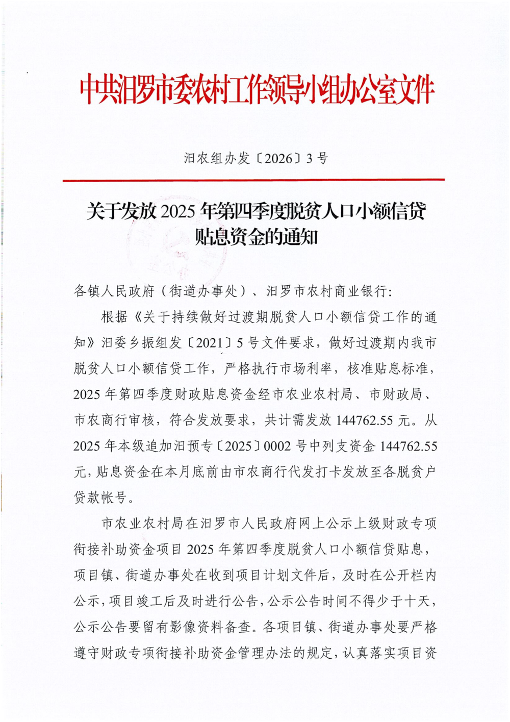 汨农组办发〔2026〕3号 关于发放扶贫小额信贷贴息(第四季度)资金的通知